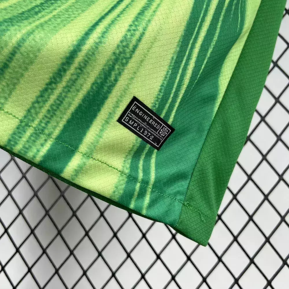 A camisa titular do VfL Wolfsburg para a temporada 2025/26 destaca-se por seu design marcante e dinâmico. A cor base da camisa é um verde vibrante, e a parte frontal apresenta um padrão em vários tons de verde que irradia para fora e para baixo a partir do escudo do VfL. Esse padrão confere à camisa uma profundidade e dinamismo especiais que refletem a energia e a paixão do clube.