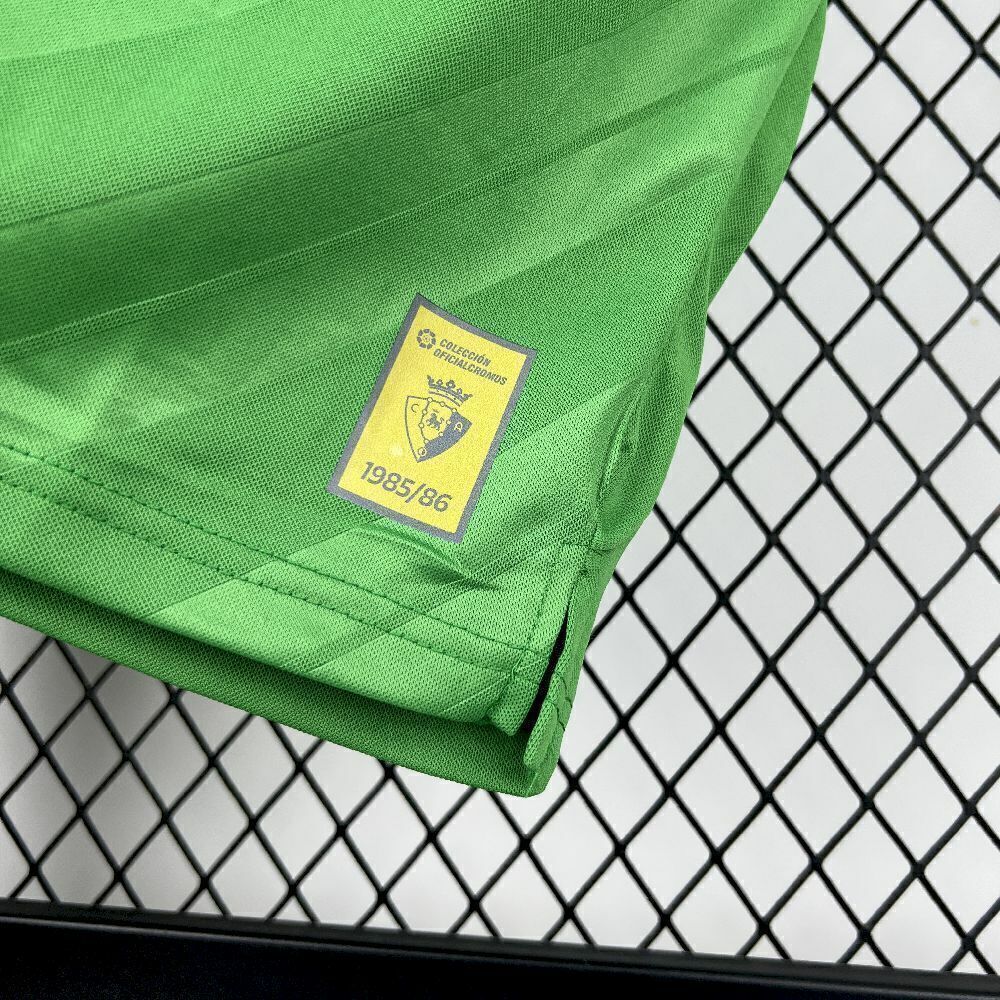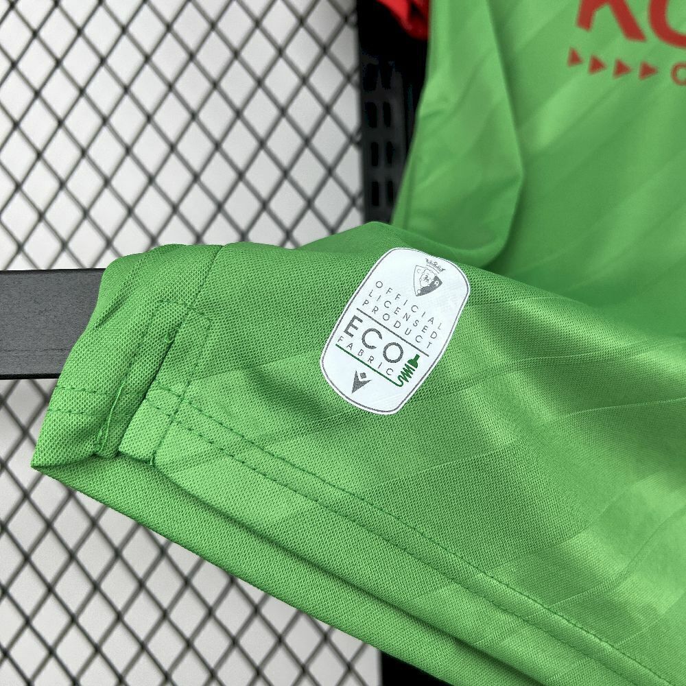 A camisa reserva do Osasuna para 2025/26 destaca-se pela base verde vibrante, atravessada por um padrão diagonal em relevo que confere ritmo e personalidade ao design. A gola polo e as mangas vermelhas, em contraste, remetem a uma das cores tradicionais do clube. Um elemento gráfico diferenciado aparece na nuca, enquanto no interior, na parte inferior da peça, uma faixa personalizada celebra as principais competições europeias disputadas pela equipe. Confeccionada com os tecidos Eco Everton e Eco Mesh, garante respirabilidade, leveza e conforto em todas as situações de jogo.