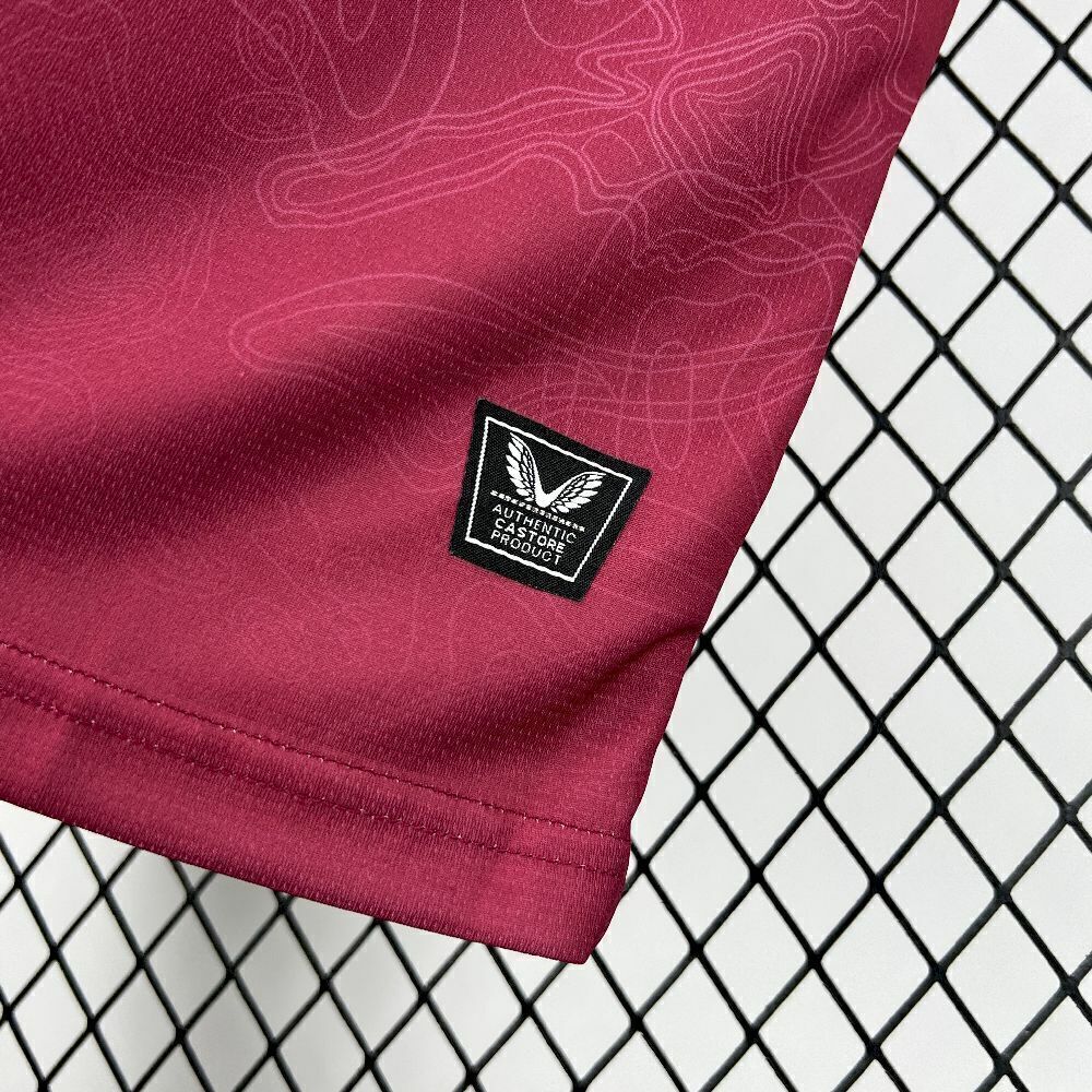 Com base em tecido aertex para respirabilidade, o design gráfico ombré da paisagem está presente na parte frontal do corpo da camisa e nas mangas. O azul adiciona contraste ao bordô na gola e no acabamento das mangas, enquanto um detalhe da gola BFC e um brasão bordô e branco completam o design.