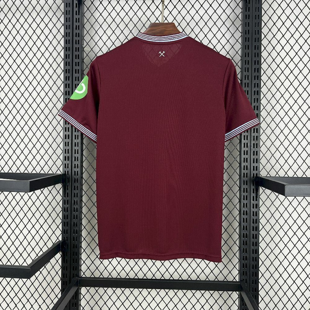 Nossa nova camisa principal é minimalista para a nova temporada. Todo em bordô com detalhes nas axilas em azul e gola V e punhos canelados com listras bordô e azul. Um clássico moderno em desenvolvimento, a camisa recupera o escudo colorido do clube, além do detalhe dos martelos cruzados na parte de trás da gola.